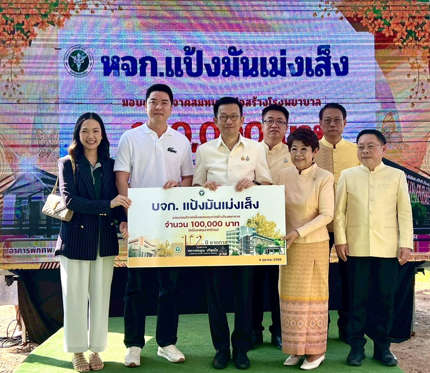บริษัท แป้งมัน เม่งเส็ง จำกัด ได้เข้าร่วมพิธีวางศิลาฤกษ์ "อาคารบำบัดวินิจฉัยและรักษาโรค 4 ชั้น" และ "อาคารนิรวาน" ณ โรงพยาบาลหลวงพ่อคูณ ปริสุทฺโธ และร่วมเป็นส่วนหนึ่งเพื่อสบทบทุนก่อสร้างโรงพยาบาล โดยมอบเงินบริจาคจำนวน 100,000 บาท